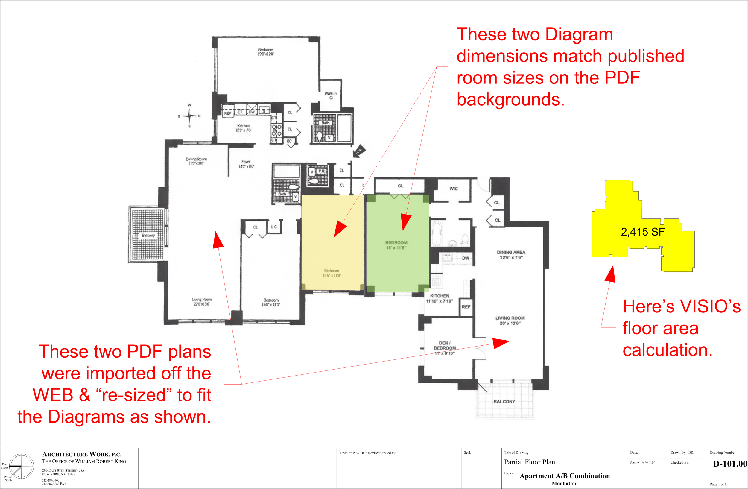 Last blog, I illustrated how I set up a drawing page, imported online sourced floor plans, pasted them onto a Microsoft VISIO drawing page (Arch Size D) and scaled them at . inch equals a foot. I also used Microsoft VISIO tools to create a diagram of the entire combined apartment, which automatically calculated the “net floor area” of the space described from which I was able to estimate a budget & provide a clear and accurate proposal for services. We got the job.