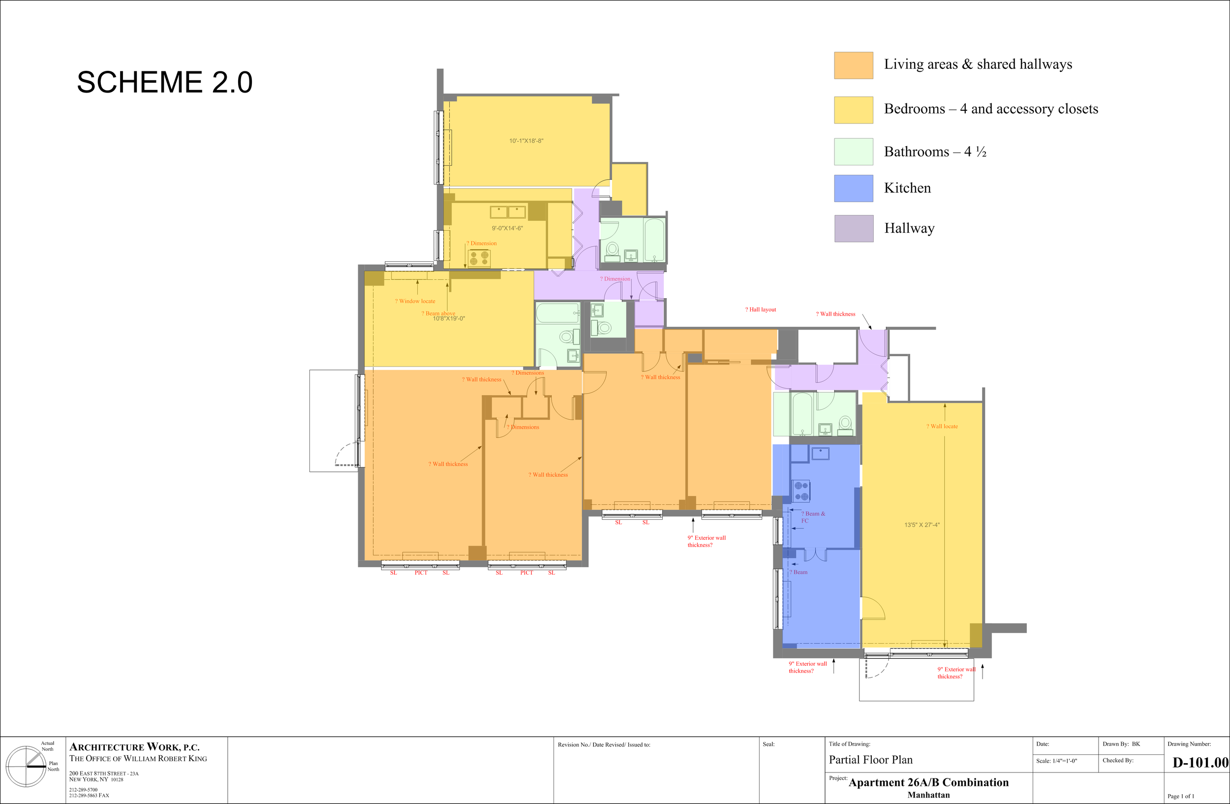 So, the schematic design began with a “clean slate”. Our client had done much “diligence” before acquiring the two units & had some pencil sketches on paper plans he cut & pasted from the plans again online from his realtor. I first presented a different plan to explore what I felt was a better concept, offered to clean up my client’s pencil sketch as a point of comparison. These two ideas are shown here, again in scaled diagrams on an architectural sized page.