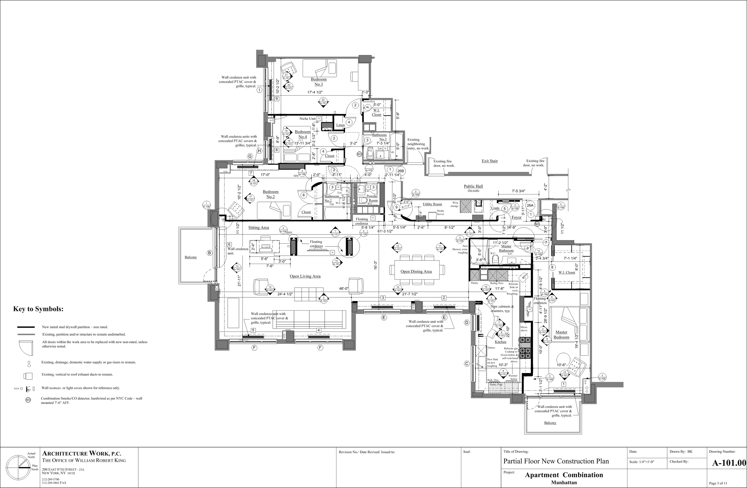 The next step was to confirm the “program” of a living and dining room with four bedrooms and three & a half baths would fit the space. This was easy as we had two existing apartment layouts with which we could all see this would work. Also, we had agreed that we would start with a total “gut” of the newly combined apartment (which had never been done in this Co-op apartment building) as the client did not wish to retain any features of the old plan, finishes, fittings or fixtures.