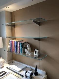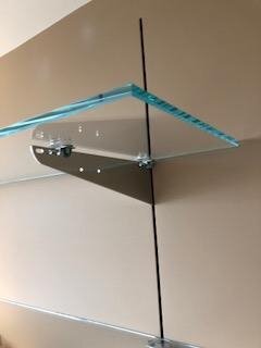 I used an 8 inch simple metal bracket (for 10 inch shelf) in this photo (no “cam” feature) onto which is attached the M276 Shelf clips and GY105 Rubber Cushions. What’s nice about this is that the Cushions are really just little suction cups that hold the glass in place so you don’t have to be concerned about anything slipping out of place. The glass is clear 3/8ths inch clear STARFIRE tempered with a square beveled & polished edge. This glass is perfectly “clear” without the green tint of regular glass, but that’s for another blog.